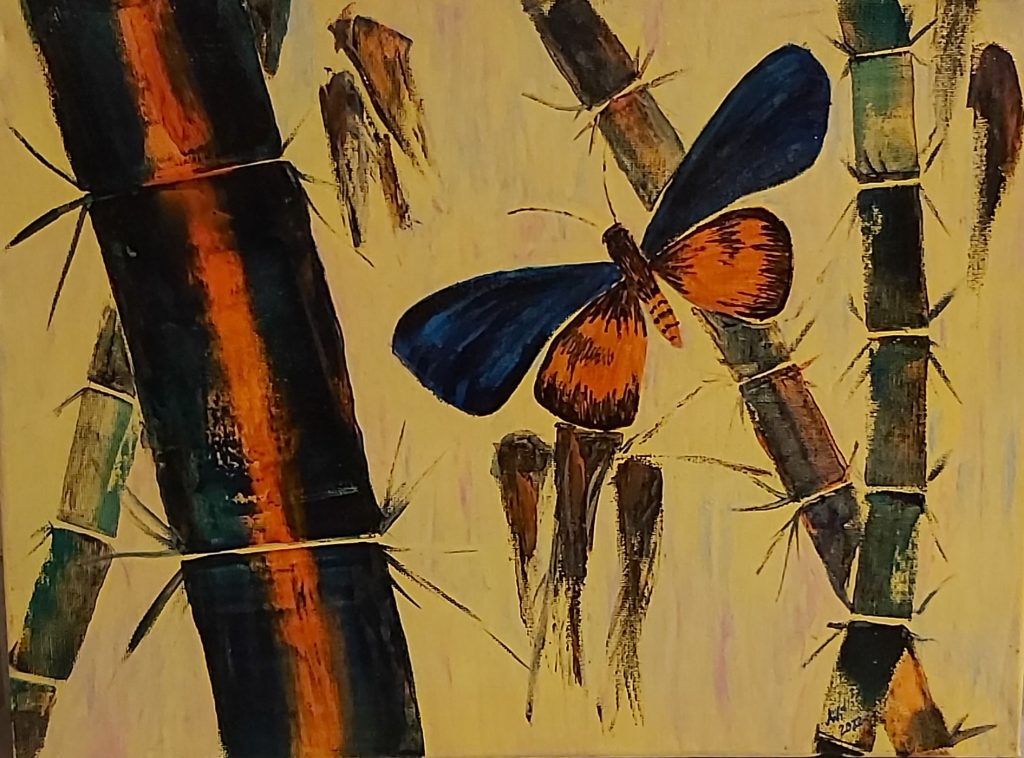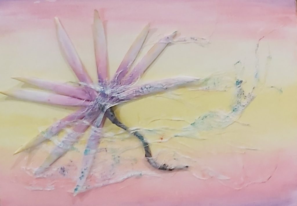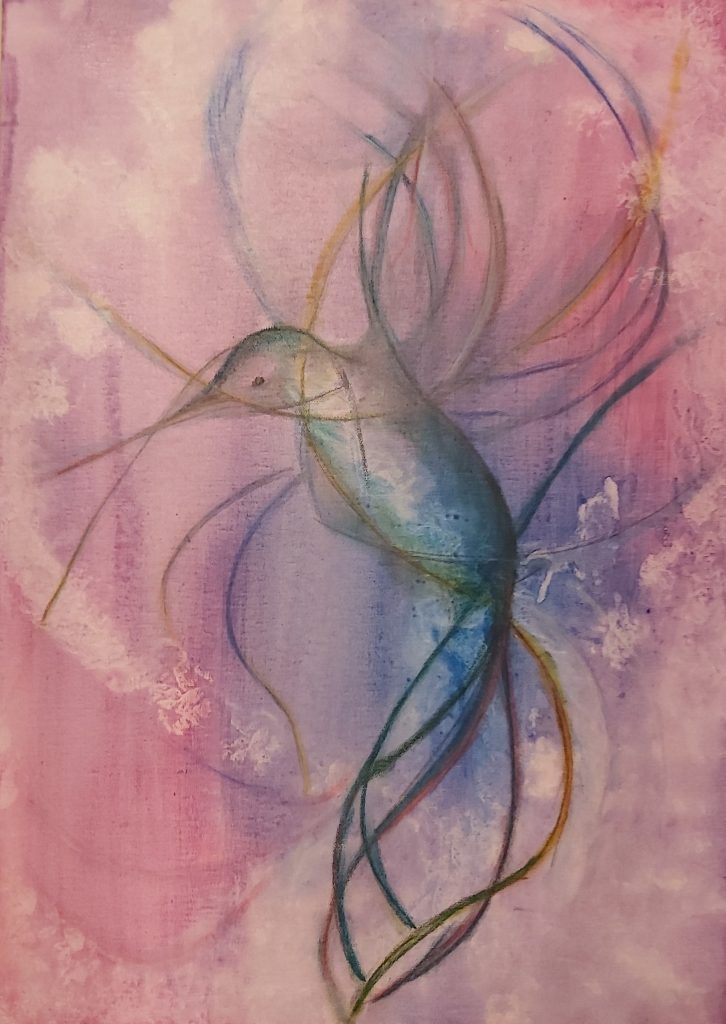 Fantasievogel (Acryl auf Leinwand mit Pastellkreide) Er fliegt bei einem lieben Menschen.