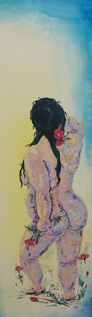 Flora schreitet durch ein goldenes Licht, ihr nackter, üppiger Körper leuchtet im sanften Schein. Mit jedem ihrer Schritte erwacht die Erde zum Leben – unter ihren Füßen brechen Blüten hervor, als ob die Welt nur auf ihre Berührung gewartet hätte.